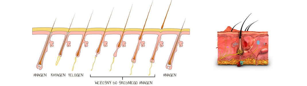 - Faza wzrostu (anagen) – faza, w której włos osiąga swoją pełną długość, są to włosy widoczne na skórze, cebulka jest otwarta, a odżywianie odbywa się przez brodawkę (połączoną z krwiobiegiem). Ta faza jest idealna do wykonania zabiegu.